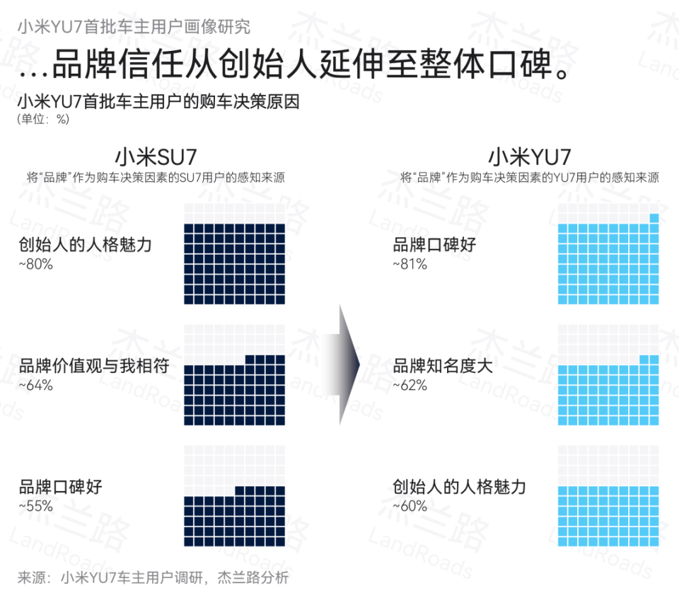 当然,还有一个异常炸裂的数据,那就是小米首批用户画像中,明显的趋势就是品牌信任从创始人延伸到整体口碑,其中创始人的人格魅力占比达到了80%!这是一个异常炸裂的数据,这意味着,首批订车的用户,也就是18小时锁单24万辆的准车主中,非常大的比例都是奔着雷军来的。因为信任雷军,所以信任小米,然后再延伸到小米yu7这款车的方方面面,这种极致的人格魅力,在国内汽车市场,除了雷军之外,至今没有其他人能达到这样的高度,所以雷军是小米最大的推销员,此言不虚。