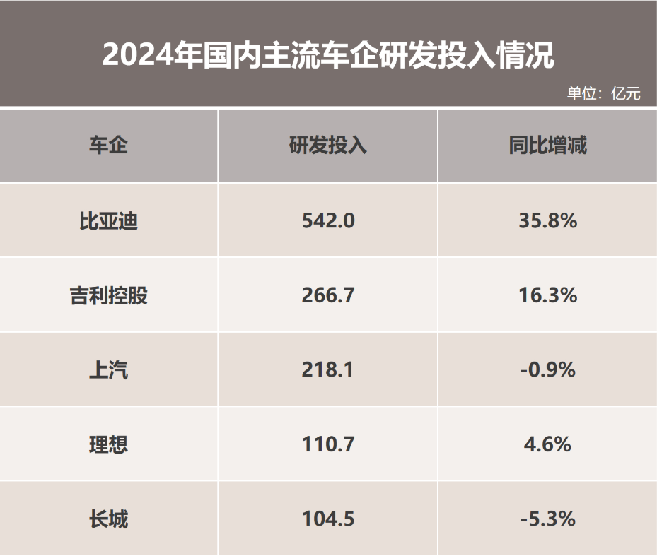 除去比较特殊的理想以及仅披露研发费用的吉利控股,长城汽车的研发投入在整个行业中仅次于比亚迪、上汽集团。