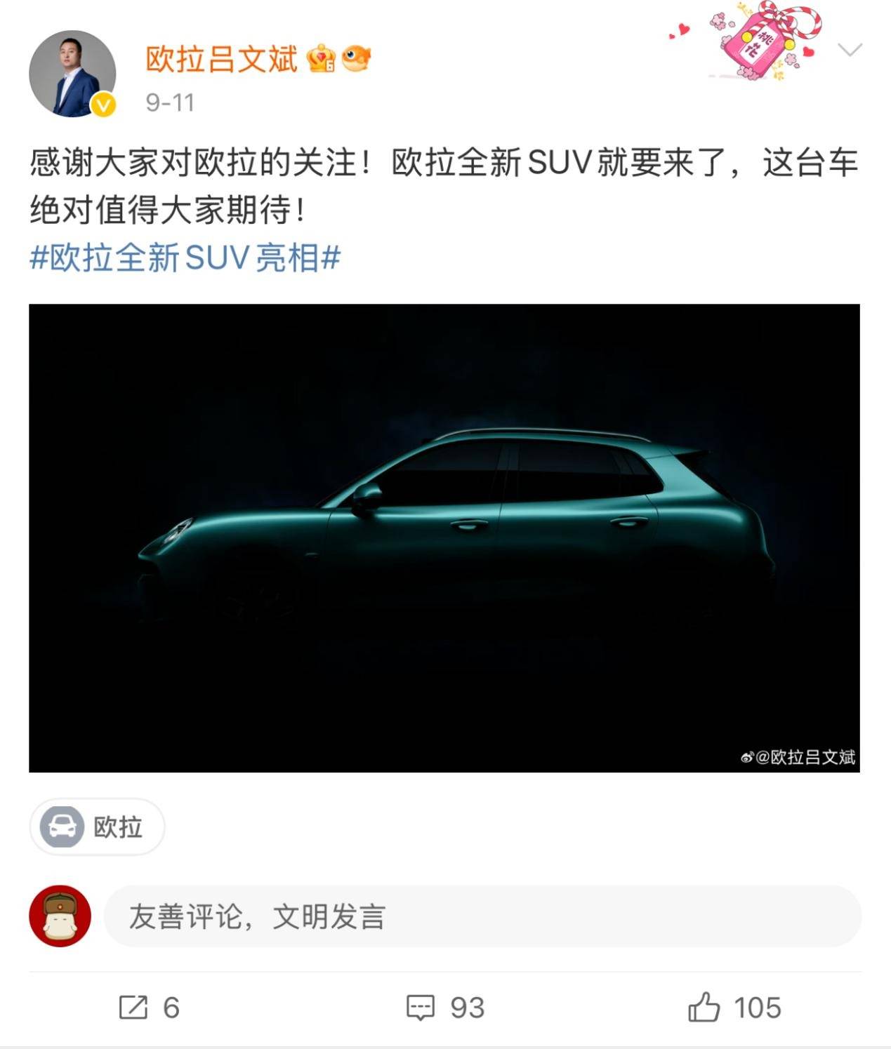 9月10日,工信部网站公示欧拉全新suv申报图及关键信息。紧接着,欧拉品牌总经理吕文斌就在社交平台发布了一张欧拉全新suv的侧面线条图,并配文“感谢大家对欧拉的关注!欧拉全新suv就要来了,这台车绝对值得大家期待!”