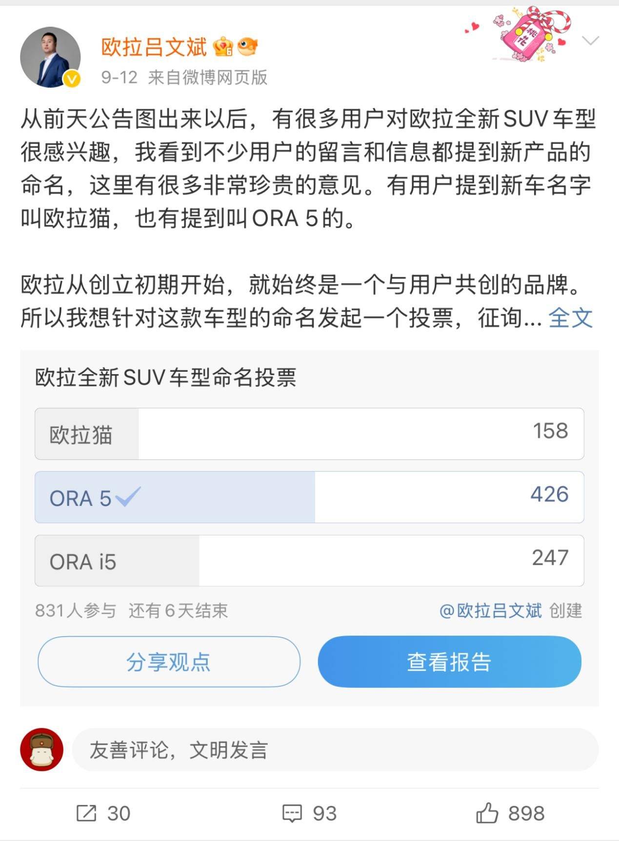 9月12日,吕文斌见到网友们兴趣如此之高,便再次在社交平台发起投票话题要和用户共创,随之欧拉汽车官方平台转发该投票信息,和网友一起参与欧拉全新suv命名讨论。