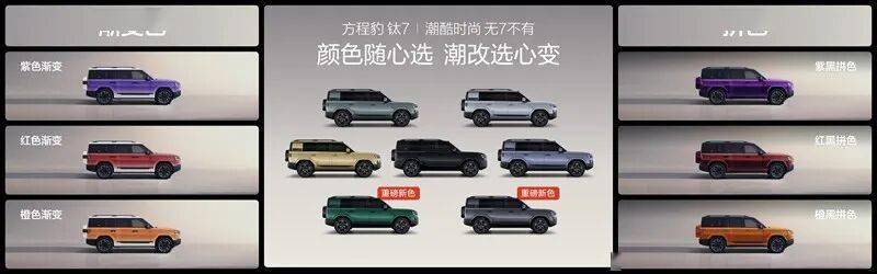 为了让广大用户选得尽兴,钛7直接一步到位,带来了7款外观颜色、3款内饰颜色,同步在官方商城上架了6款潮改方案,可满足不同用户的审美偏好。