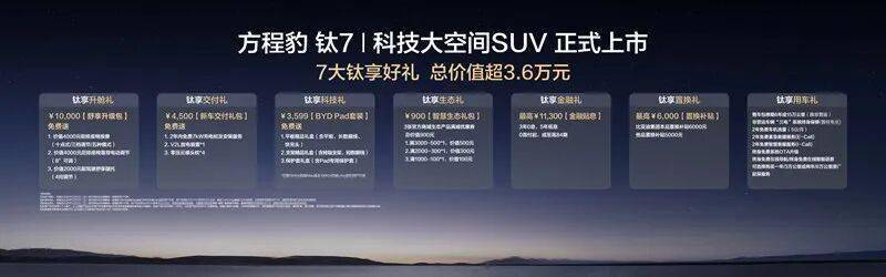 在购车权益上,方程豹更是诚意十足,为首批车主带来了总价值最高超3.6万元的7大钛享好礼!其中包括:覆盖多项座椅舒适配置的总价值10000元舒享升级包、价值3599元的byd pad套装、价值4500元的新车交付礼包均免费送;提供3年0息、5年低息、0首付起或至高84期等多重金融方案以供选择,金融贴息最高价值11300元;还有最高价值6000元的置换补贴、价值900元的智慧生态礼包,以及2年5g每个月的免费车机流量、非营运车辆长达6年或15万公里的整车包修、“三电”系统的终身保修、终身免费系统ota升级等,让每一个家庭都能轻松拥抱钛7,让美好生活触手可及。